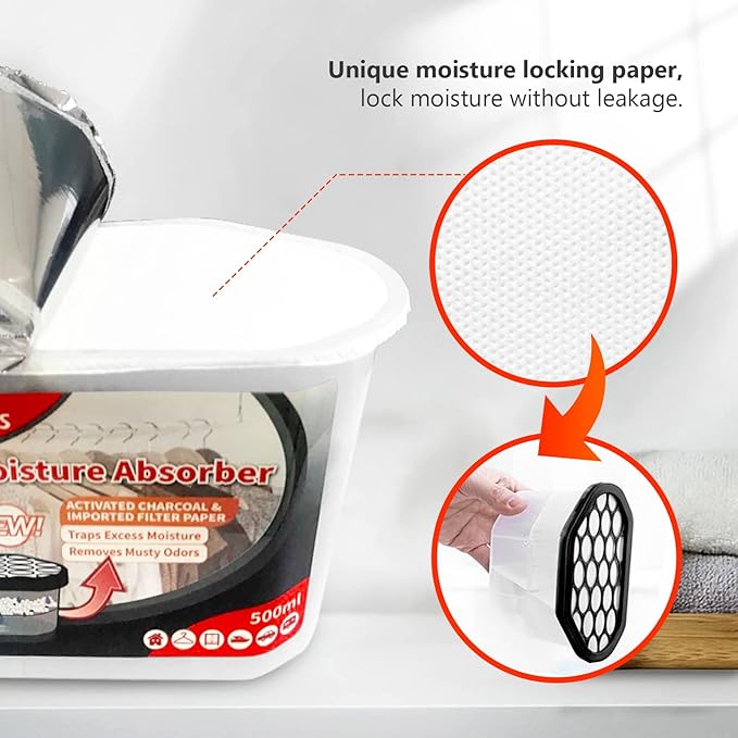 - Efficient Dehumidification: Traps excess moisture quickly. Vacplus moisture absorbers use spherical calcium chloride to enlarge the absorbing area. The large collecting capacity of this moisture remover keeps a long time dry.