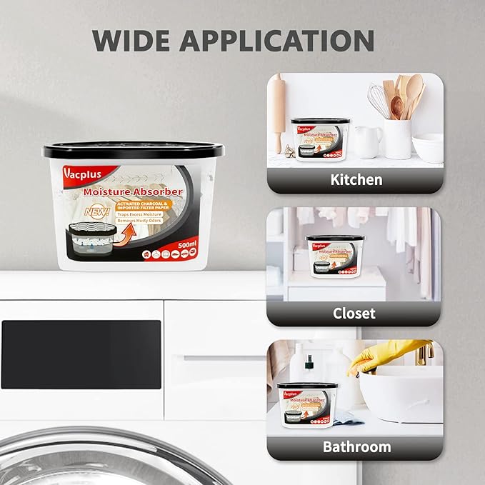 - Premium Quality: To prevent water leakage, Vacplus Closet moisture absorber designs with unique lock wet paper and high-quality collecting layer. This dehumidifier remover works great for your bathroom, basement, kitchen, laundry room, etc.