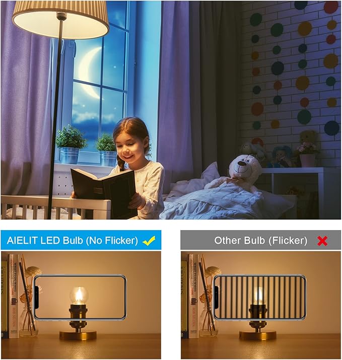- 💡 NO FLICKER - 2700K warm white glow, no mercury, no UV & IR, no dazzling, AIELIT E12 Edison globe light bulbs is elegant and beautiful in appearance, brightness and color, perfectly creating a warm, healthy and cozy atmosphere for home, eliminating eyes exhaustion caused by the conventional lamp. High CRI (color rendering index) shows truer colors of various objects