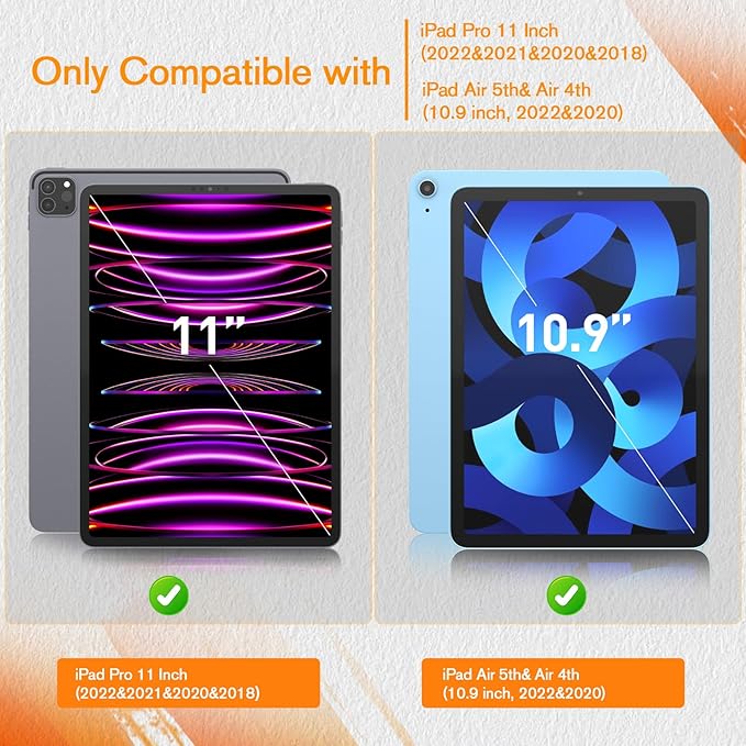 - Compatibility: Specifically compatible with iPad Pro 11 inch M2 (2022), iPad Pro 11 Inch (2021, 2020, 2018 Models), iPad Air 5, iPad Air 4 (10.9 inch,2022 and 2020), compatible with the Apple Pencil. Fit models: A2762, A2761, A2435, A2759, A2588, A2589, A2591, A2316, A2324, A2325, A2072, A2377, A2459, A2301, A2460, A2228, A2068, A2230, A2231, A1980, A2013, A1934, A1979
