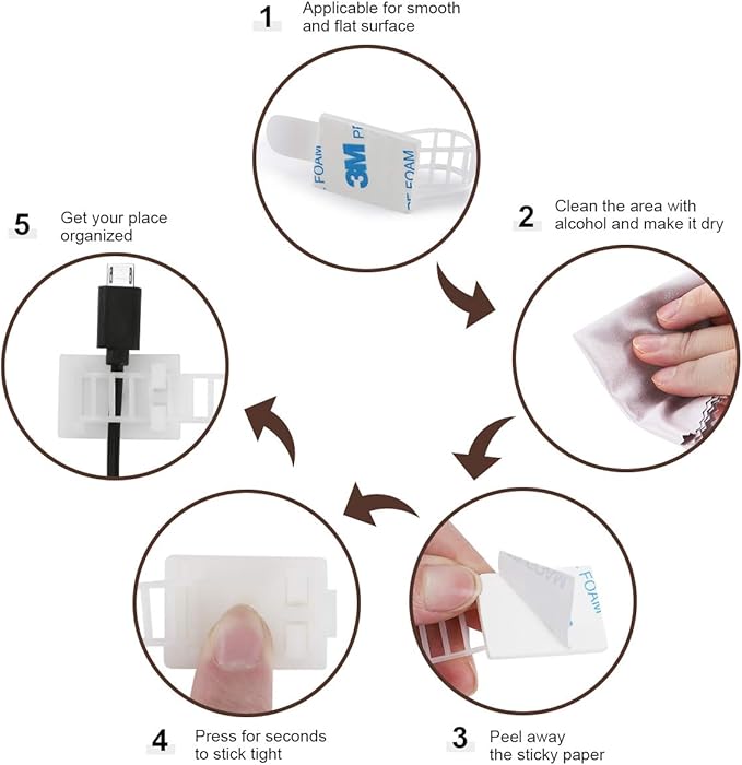 - 【WARM REMINDERS】- Please adhere the tape backing on even and flat surface when you use these adhesive cable clips, such as on desk, wood floor, tile wall, steel... Feel free to use since the self adhesive tape would never cause furniture damages or leave any residues. What’s more, we ensure 100% customer satisfaction with 60 day NO-QUESTION-ASKED money back guarantee