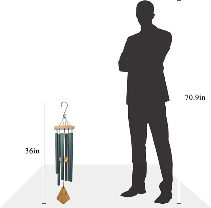 - Unique Wind Chimes Design-36-inch height from hanging hook to bottom wind catcher, the top beech wood offers a unique look. Secured with black nylon string, they hang from a strong S hook, EASILY TO HANG. 6 aluminum powder-coated tubes are hand-tuned; you can enjoy peaceful melodies that play as a whisper in the wind