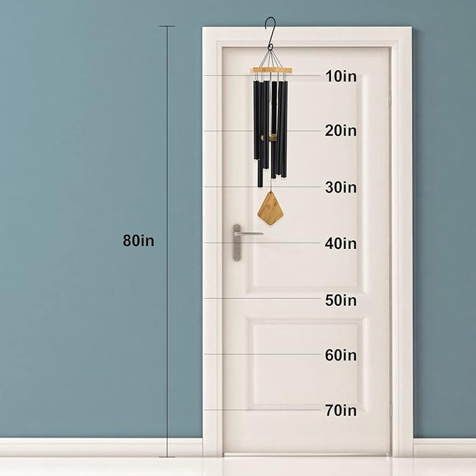 - Unique Wind Chimes Design-36-inch height from hanging hook to bottom wind catcher, the top beech wood offers a unique look. Secured with black nylon string, they hang from a strong S hook, EASILY TO HANG. 6 aluminum powder-coated tubes are hand-tuned; you can enjoy peaceful melodies that play as a whisper in the wind.