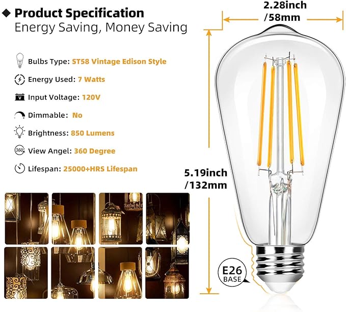 - Energy saving & Long lasting Design: Generating the same brightness, our ST58 non dimmable LED bulbs can replace 60W incandescent bulbs with only 7W needed. It means the bulbs can help you save at least 90% of electricity bills without undermining lighting effects. Due to a long lifespan of 25, 000+ hours without any damage or improper use, you needn't worry about frequent bulb replacement any more. Brightever bulbs will be your best lighting partner and illuminate your space as you want.
