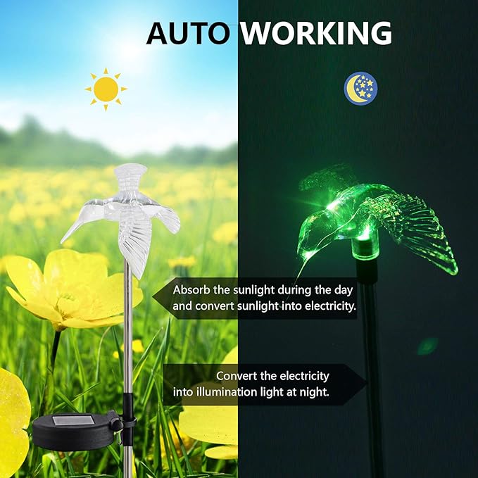 - SOLAR POWERED. The outside landscape LED light is solar powered. Solar hummingbird garden light absorbs solar energy during the day and turn on automatically at night. You don’t need spend a single cent on electricity or batteries.