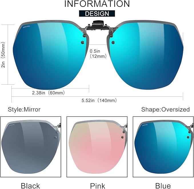- PACKAGE CONTENTS:1 * lens Dark gray, 1 * lens Blue mirror, 1 * lens pink mirror. Total of three sunglasses Clips in the package.