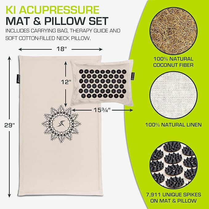 - LUXURIOUS QUALITY – Made of 100% natural linen & coconut fiber filling, the acupressure mat has 6,534 acupressure points; neck pillow is filled with soft PP Cotton and has 1,377 acupressure points.