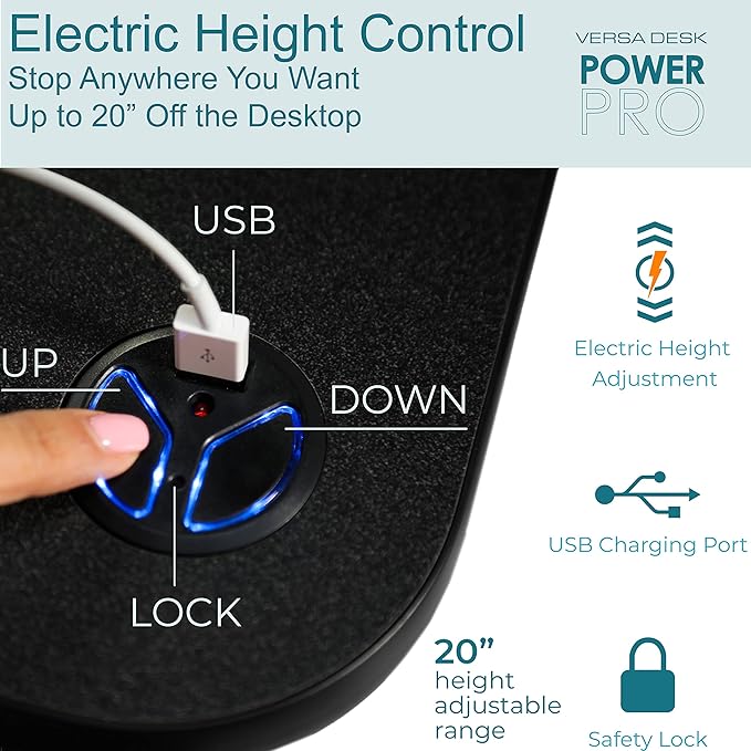 - ELECTRIC STANDING DESK CONVERTER - VERSADESK desk converter is Made in the USA. Size: 40" W x 24" DHolds 80 lbs; Converts a traditional computer desk to a sit to stand desk; Felts are attached to the base to protect your desk from scratching; Fast and quiet desk height adjustment; Fully electric power without stopping points; Easily achieve the ergonomic height from 5" to 20” from table surface, ideal for home office, office working station; Monitor and monitor arm not included