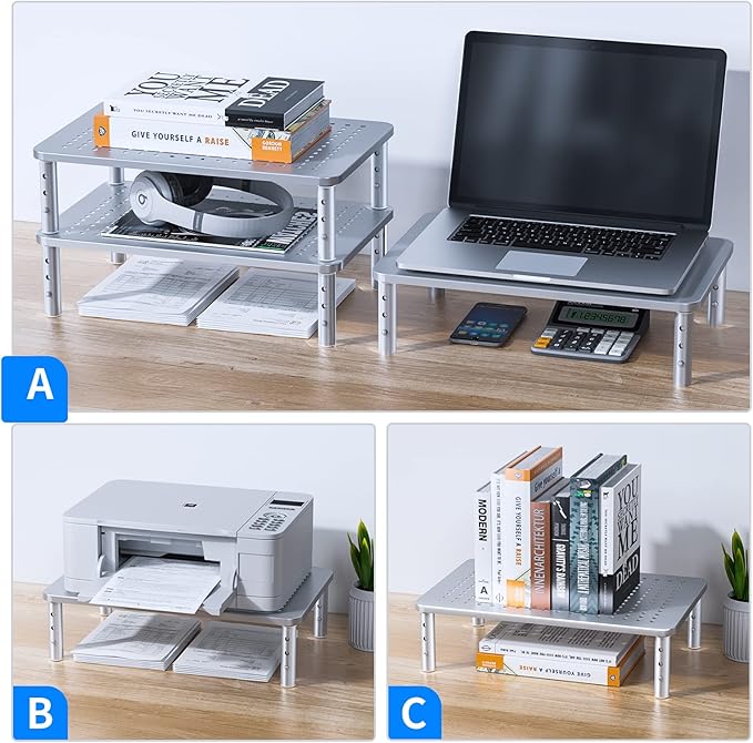 - DESKTOP ORGANIZER: This computer monitor stand provides 12.40” x 7.09” x 5.51” storage space underneath the platform to organize office supplies. Stack two monitor stands together to double the functionality of your workspace.
