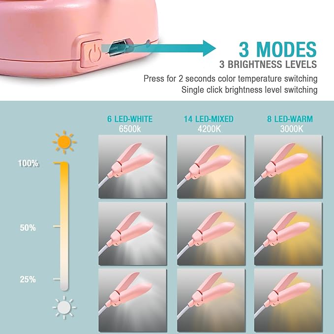 - [Eye Care & 3 Color Modes] Vekkia book light is equipped with 14pcs upgraded SMD LEDs which filters 99.9% blue light to protect your eyes and to reduce your eye strain. Book light for reading in bed has 3 color modes. Whether you like warm or white light, bright or soft, our "whale usb rechargeable book light" can meet your satisfaction perfectly.The dimmable reading light is bright enough for reading, knitting, sewing & craft, or dim enough to not disturb the others.