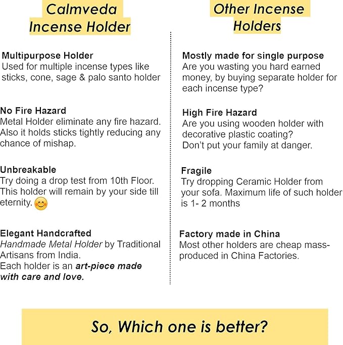 - MULTIPURPOSE INCENSE BURNER - Holder allows use of 2 standard sized incense sticks at once. Further since it is made of metal, you can use it for incense cones, palo santo or any other incense burning.