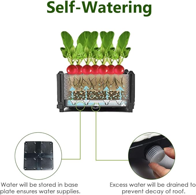 - đ»ăSelf-watering And Drainage SettingăEach raise garden bed features with the design of self-watering disk and drain holes, which can easily cope with various extreme weather such as drought and heavy rain. And each drainage hole with a plug allows you to manually control the moisture to prevent the roots from rotting or over-drying out for the plant to thrive.
