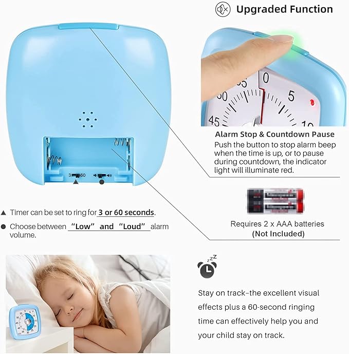 - Kids Friendly: The kids timer allows children to easily and intuitively understand the passage of time through a gradually decreasing blue disc. Adjustable Alarm Level: Loud(about 70 dB) or Low(about 50 dB), Adjustable Beep Duration: 3 or 60 seconds