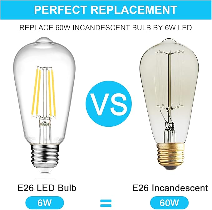 - Saving Money: Ascher pack of 12 units E26 LED filament bulbs replace 60W incandescent bulb by 6W LED, save over 90% on electricity bill of lighting. Note: This E26 LED bulb is not dimmable, please do not use them with dimmer switch