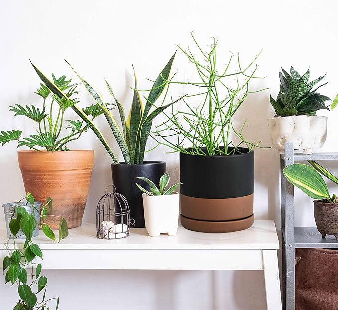 D'vine Dev Set of 2 Plants Pots, 8 Inch Ceramic Planter Pot for Plants with Drainage Hole and Saucer, Black/Speckled Tan, 94-V-D-7