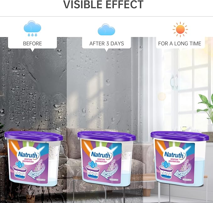 - 【EFFECTIVE DEHUMIDIFICATION】The NATRUTH moisture absorber box can effectively absorb extra moisture from the air and trap the moisture in box. This product features a large capacity of 12.5 oz globular calcium chloride particles inside moisture absorber could efficiently enlarge the dehumidifying area , keeping the place comfortable for a longer time.