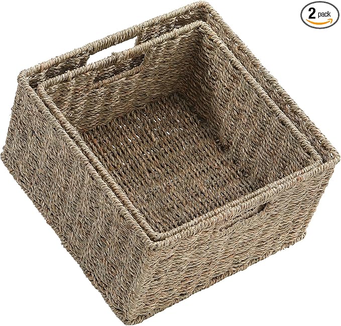 HOONEX Wicker Storage Baskets for Organizing, Decorative Woven Seagrass Baskets for Storage with Carrying Handles, Set of 2, Natural