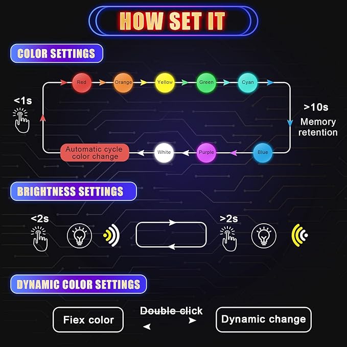 - Nice brightness setting: if you like stable color in fixed brightness, long click the button for 2s to switch the light dimmer or brighter
