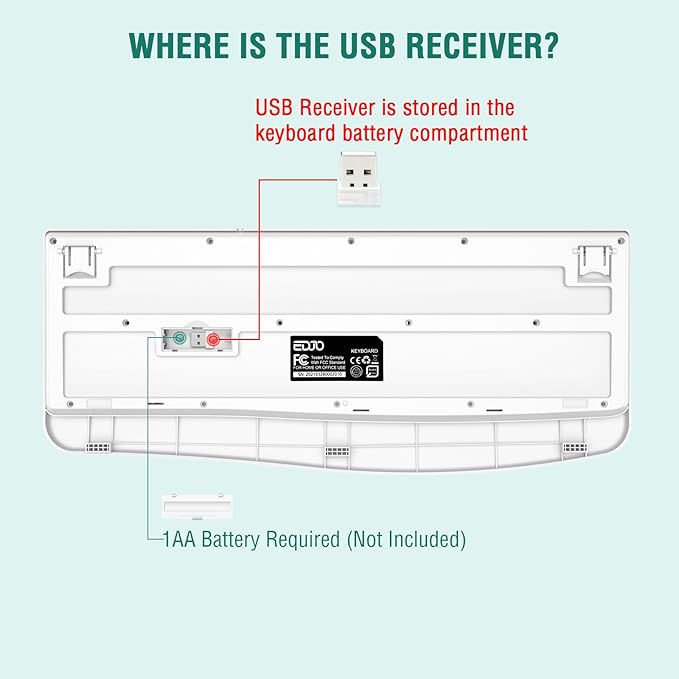 - 【Ergonomic Wireess Keyboard】EDJO Full-sized wireless keyboard is ergonomically designed with Palm Rest and folding holder that can keep it at an optimum slope, prevent your wrists from hurting while long sessions of typing. Keyboard is also designed with anti-slide pads so it will stay in place when you're typing quickly. Note: The USB receiver is in the battery compartment of the the keyboard, you can find it when open the keyboard battery cover.