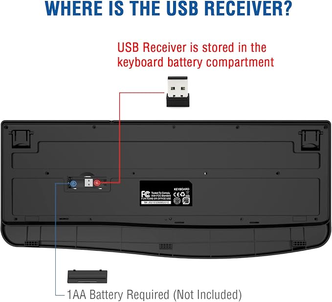 - 【Ergonomic Wireess Keyboard】EDJO Full-sized wireless keyboard is ergonomically designed with palm rest and folding holder that can keep it at an optimum slope, prevent your wrists from hurting while long sessions of typing. Keyboard is also designed with anti-slide pads so it will stay in place when you're typing quickly. Note: The USB receiver is in the battery compartment of the the keyboard, you can find it when open the keyboard battery cover.