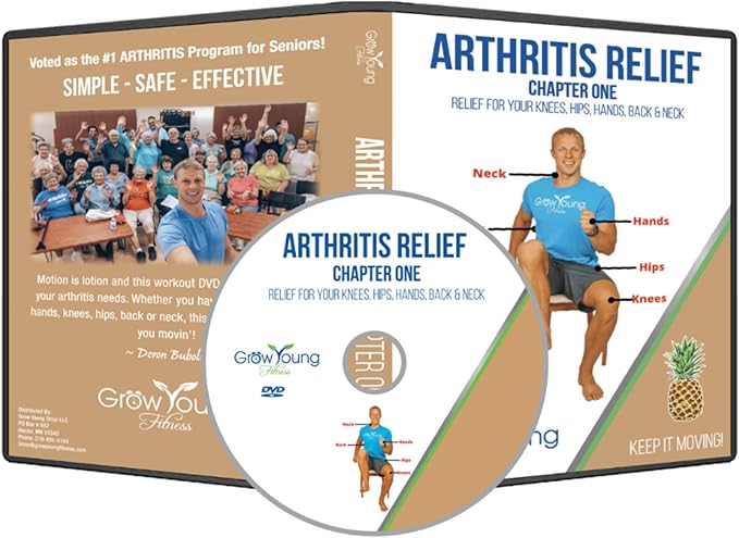 - ARTHRITIS RELIEF EXERCISES - Keep your body moving in rain or shine with these at-home senior exercises. This exercise DVD incorporates 6 physical therapy routines that ease the aches and pains of arthritis. There are 6 workouts, with each video duration ranging from 15 to 19 minutes long, that target pain relief in the neck, back, knees, hips, hands, and overall body. Practice these senior exercises 2-6 times per week for best results.