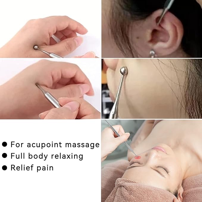 - DOUBLE HEAD DESIGN: Dual head with two different size nibs for positioning and massaging ears, face and body parts. The body point probe can be easily and safely grasped. Physiotherapists can use it to provide professional services to their clients and ease the burden on their fingers.