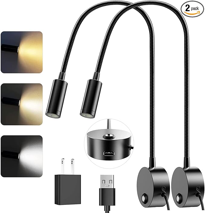 Wall Mounted LED Reading Light with 15" Flexible Gooseneck, Dimmable Book Light for Reading In Bed with USB Charging Port, Plug In Headboard Night Lights, 3 Colors Temperature, Touch Control-2 Pack