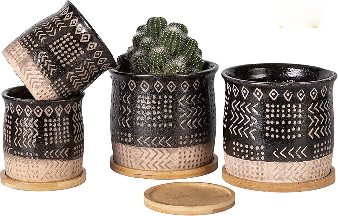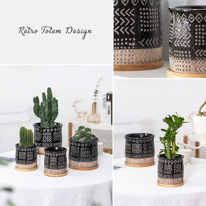 TAMAYKIM 5.5 + 4 Inch Ceramic Boho Plant Pots with Drainage Holes, Retro Totem Design Porous Planters for Indoor Outdoor Flower, Snake Plant, Succulent, Cactus & Herbs, Set of 4, Black