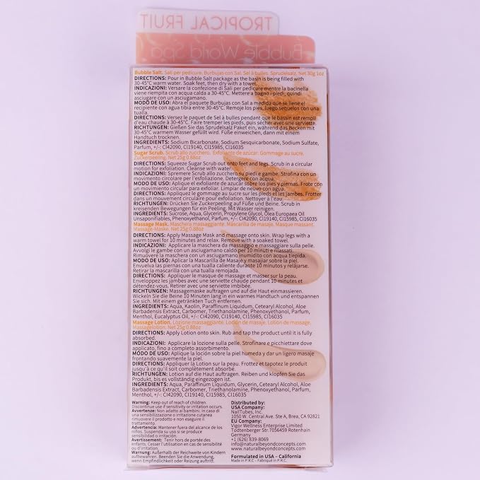 - 🥭[Package Includes]: Exfoliating Foot Spa Pedicure Kit consists of Bubble Salt, Sugar Scrub, Massage Mask, and Massage Lotion for a 4-step foot spa at home. Formated to be gentle on the skin, you are sure to feel your skin feeling soft and supple after use.