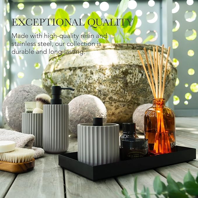 - Exceptional Quality & Style - Our All Grey Collection feature a ribbed texture with matte black accents. Made with high-quality resin and rust-proof stainless steel, our collection is durable and long-lasting. The pump of the soap dispenser is sturdy and easy to use. The base of each piece includes rubber studs that prevent slipping and scratching while keeping your counter dry.
