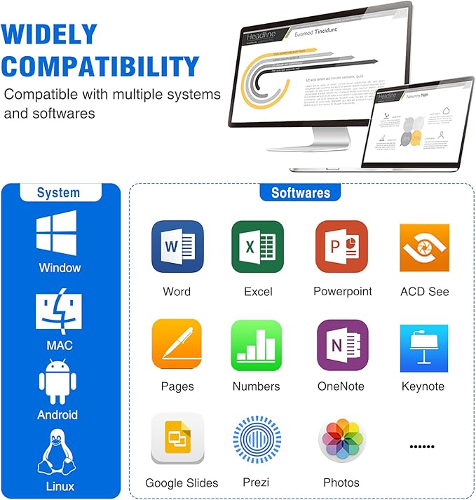 - 【Functions & Supports】Presenter remote support function: Black/Full screen, Page forward/ backward, Volume control, Mouse Feature, Open hyperlink, Switch windows and etc. Presentation pointer support systems:Windows 7/8 or above,Mac OS / Linux / Android. Powerpoint clicker support software: PowerPoint, Keynote, PDF, Word, Excel, Google Slides, Prezi and etc.