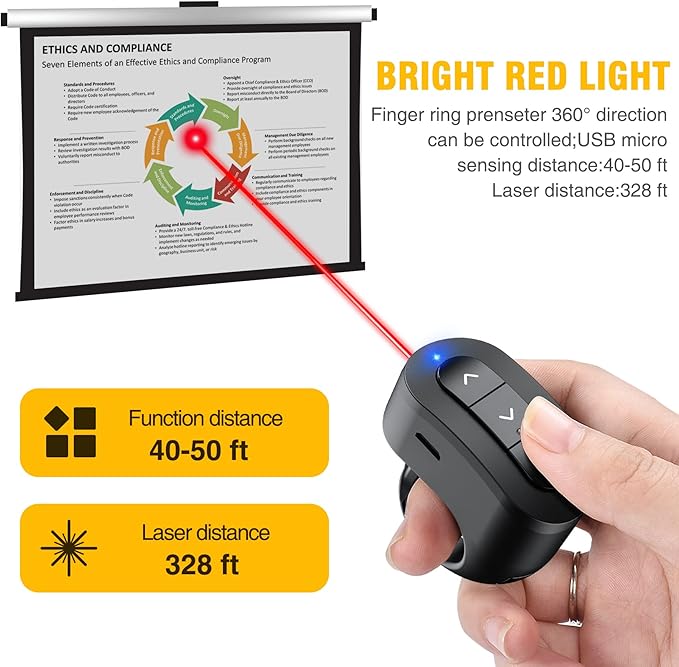 - BRIGHT LIGHT & LONG CONTROL RANGE-Bright red light that is easy to see against most backgrounds (Not recommended for LED/LCD screens); Powerpoint remote control range is 40-50FT, light control range is 328FT, so you can free to move around the room and interact with your audience