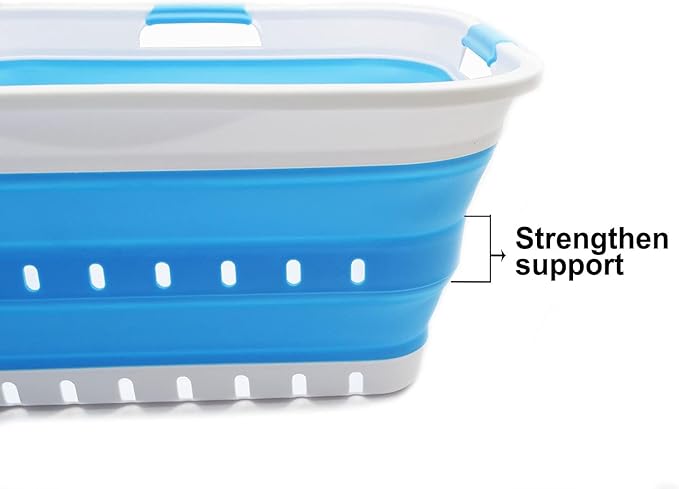 - BPA Free. Comfort grip handles for easy carry. User friendly by simply pop-up to open when using and collapses to flat for space saving