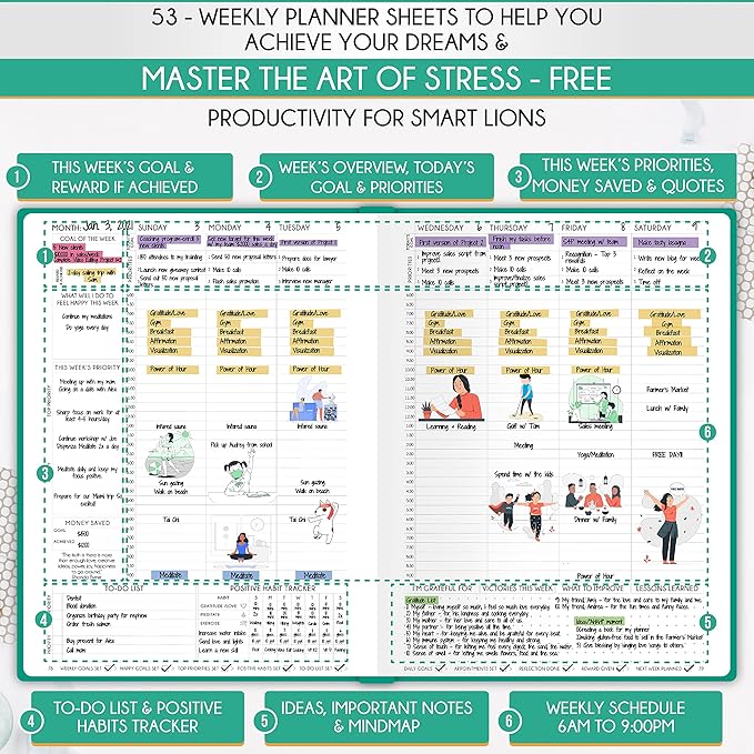 - UNDATED PLANNER - All the tools for success you need to create the life you've always wanted. This planner measures A5 (6 x 8.5 inches) and boasts thick 100 gsm paper. It features a Horizontal Planner layout, offering 212 pages for life transformation, including 53 weekly spreads, 12 monthly planning overviews with reflection sections, 22 dotted journal pages, habit trackers, mind maps, morning and evening routines, inner pockets, pen holder, and comes in a gift box. This life planner is undated, serving as a daily, weekly, and monthly planner, giving you the freedom to start your journey whenever it suits you best.