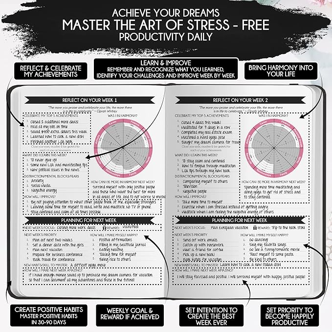 - LUXURIOUS AND TOP QUALITY - Self-care journal for women and men, perfect for entrepreneurs, professionals, college students and everyone who has burning desire to turn dreams into reality! FREE VIDEO MINI-COURSE: You will learn 10-min morning routine used by the most successful people to 10-fold your productivity, focus, happiness & passion! You will master setting goals & fix procrastination!