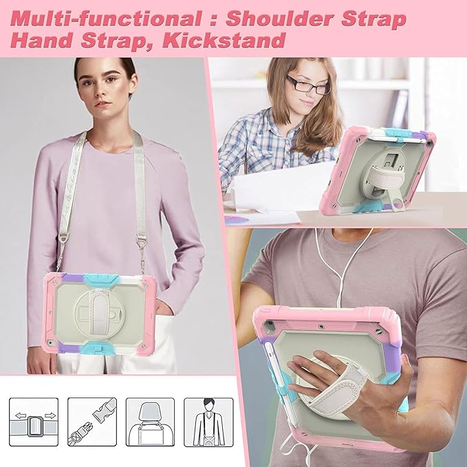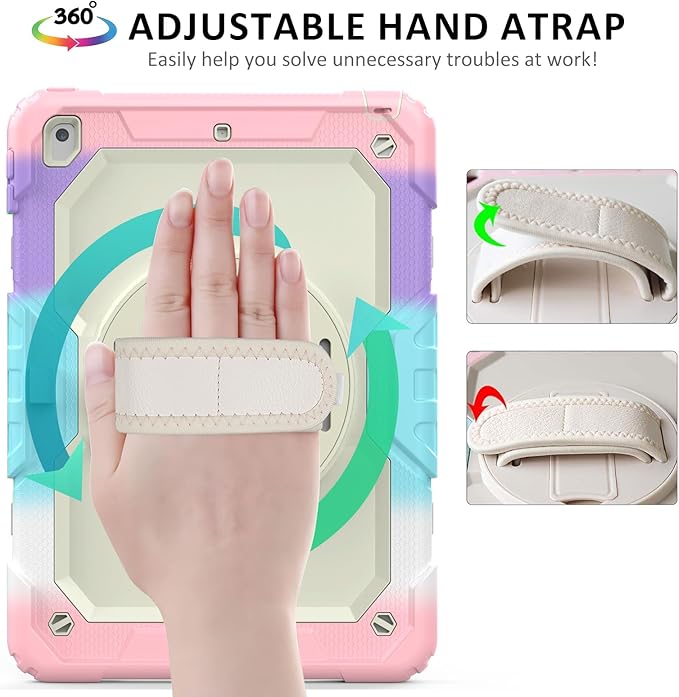 - Hand Strap & Shoulder Strap & Rotating Kickstand: The adjustable hand strap helps you hold your iPad 10.2 easily. And you could carry it convenience with shoulder strap. With rotating kickstand, you can get the watching angle and typing angle as you want