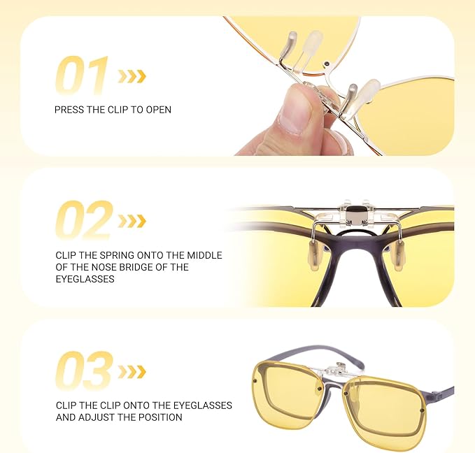 - ❤Flexible And Convenient– The clip-on night vision glasses made of transparent and lightweight alloy material, this small clip-on looks great and is sturdy, can be flipped up 270°as you need, and is every easy to fit onto your glasses – press, clip and it’s done.