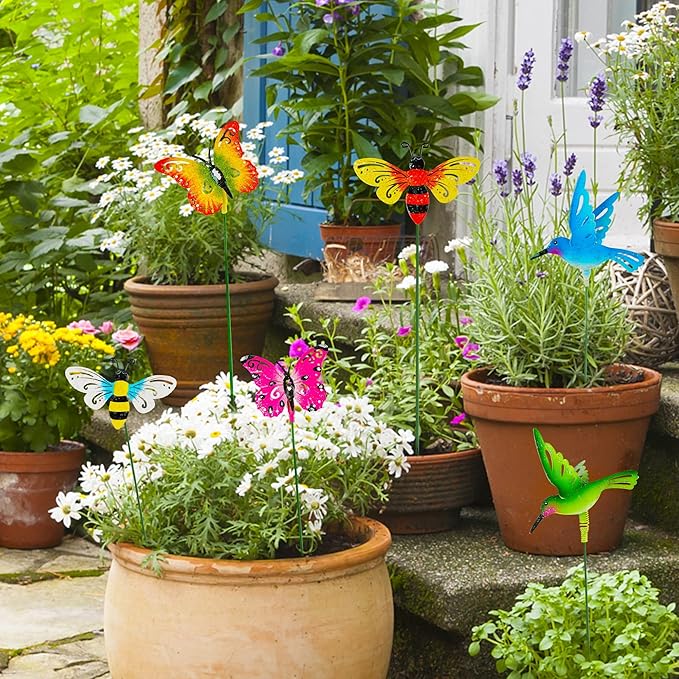 - 6 Pack Metal Garden Stakes: Our outdoor cute yard decorative stakes include 2 butterflies(yellow and pink), 2 hummingbirds(green and blue), 2 bees(yellow and white). Place them in your garden, yard or anywhere you want, they will bring more refreshing feel of nature.