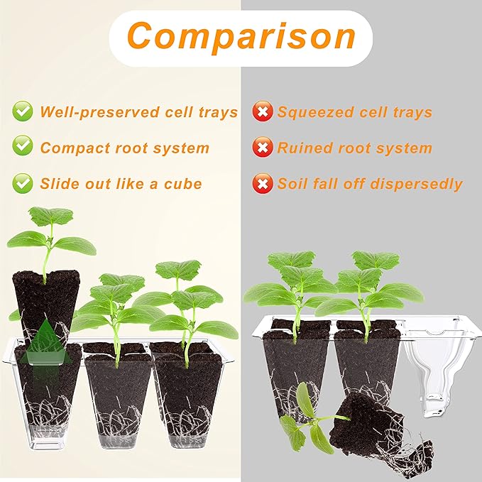- Detachable Base - The base is designed to be detachable and on the inside of the seed starter tray, works amazingly to eject roots smoothly out. It's the only way to safely, basically risk free, to get the plant out of its seedling home. No squeezing trays makes they become truly reusable!