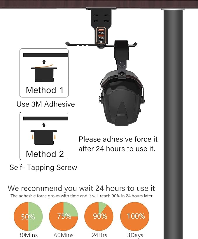 - [Secure Under-Desk Adhesive or Screw Mounting]Easily install the headphone holder under most desks using strong 3M adhesive tape or screws (included). Provides a flexible and reliable mounting solution for different desk types.