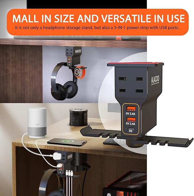- [Dual Headphone Stand with Integrated Charging Hub]This headset holder features a built-in charging station with 2 AC outlets (800W) and 3 USB ports (1 USB-C, 2 USB-A) to power your headphones, phone, and other devices all at once.