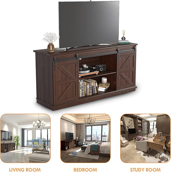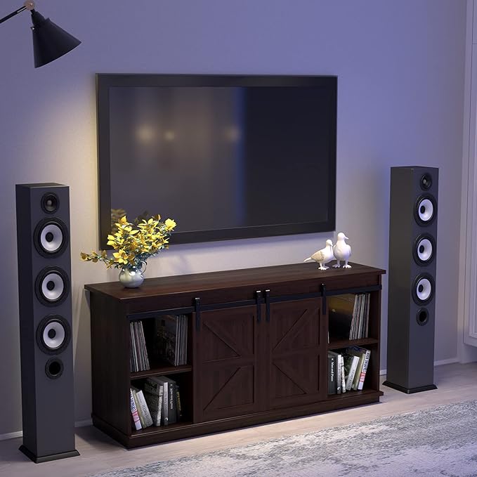 - Sufficient Storage Space: This TV stand console comes with 2 cabinets of storage space and 2 open spaces in the barn doors on both sides with 3 levels of adjustable and removable shelves, providing abundant storage or display space for CDs, DVDs, game boxes, decorative items and more. The spacious tabletop supports 40, 43, 50, 55, 60, and 65 inch TV.