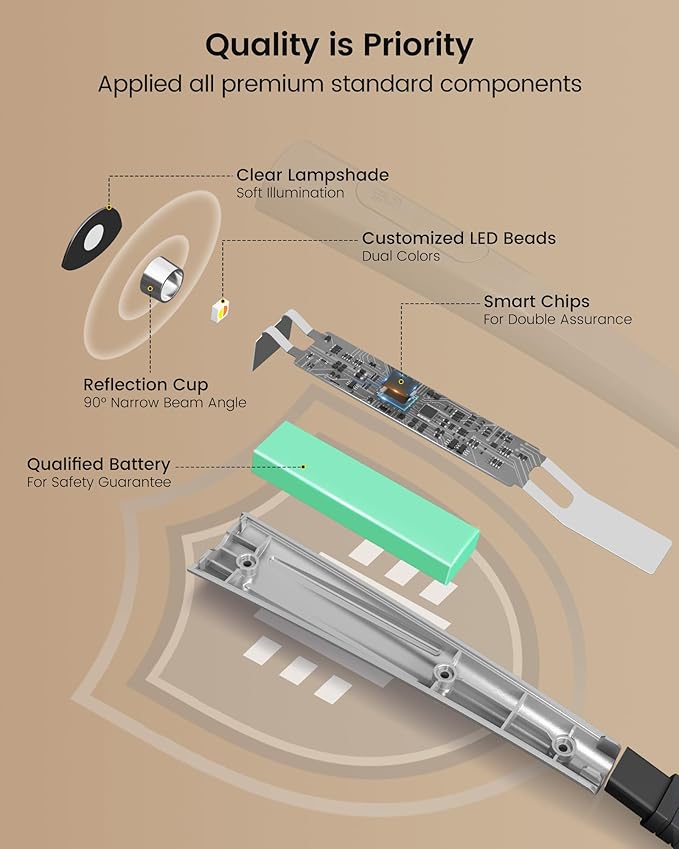 - [3 Colors & 3 Brightness Adjustable] 3 color temperatures: amber light (1800k) / warm white light (3200k) / cool white light (6000k). The special 1800k amber mode blocks 99.99% blue light for eye care. Choose amber light for reading in bed, cool light for knitting, and white light for repair. Also, this book light has 3 dimmable brightness levels; you can choose different light settings for multi-purposes.