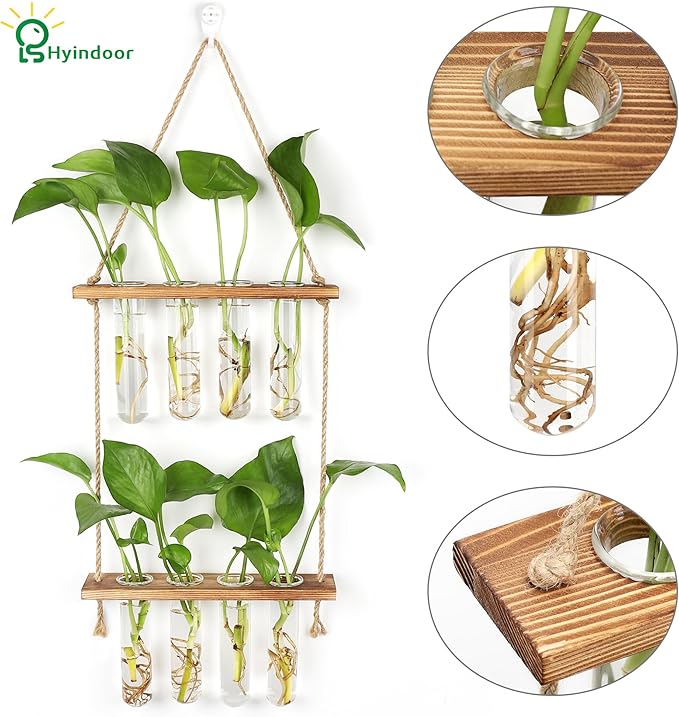 - High Quality - This test tube propagation station is made of Premium Quality High Borosilicate Glass and Natural Wood. The rope is strong and can be used to decorate your space for a long time.