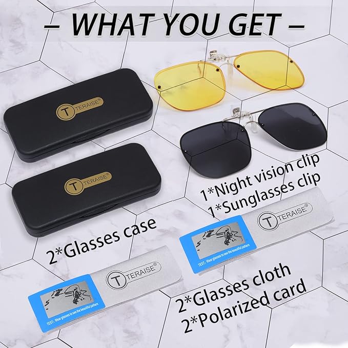 - ❤WHAT YOU GET– sunglass clip-on *1 ,Night Vision clip-on * 1, storage case * 2, high quality cleaning cloth * 2, polarization test card * 2, as well as our 18-month worry-free warranty and friendly customer service.