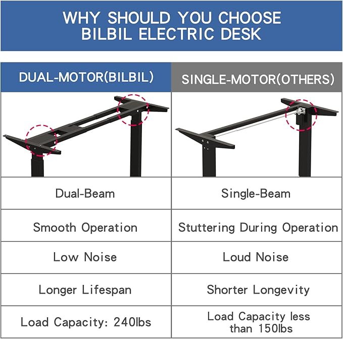 - BilBil Dual Motor System Standing Desk Frame offers smoother height adjustments, at a faster speed with lower noise (under 50 DB).
