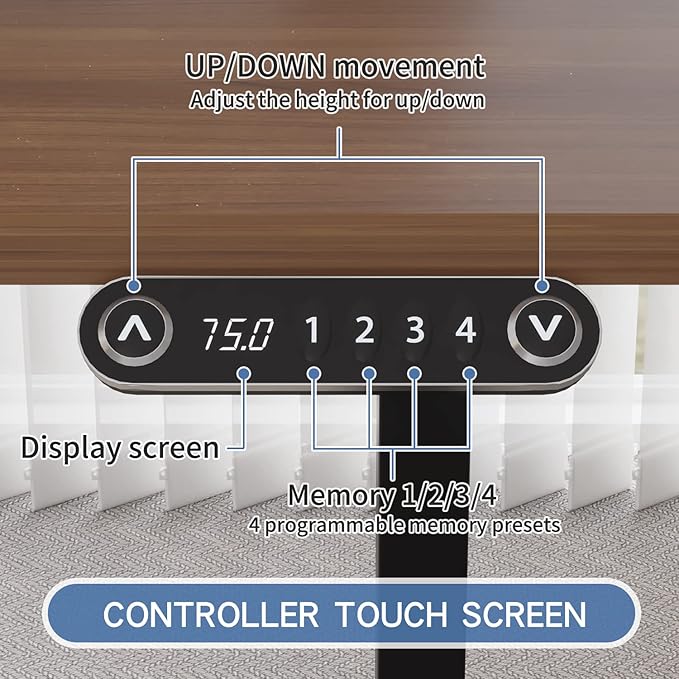 - 4 Programmable Memory Presets. To save the current height setting: Press and hold any number key until you hear a beep. Long press the up key and "M4" to change the unit from cm to inch.