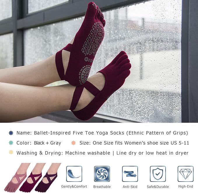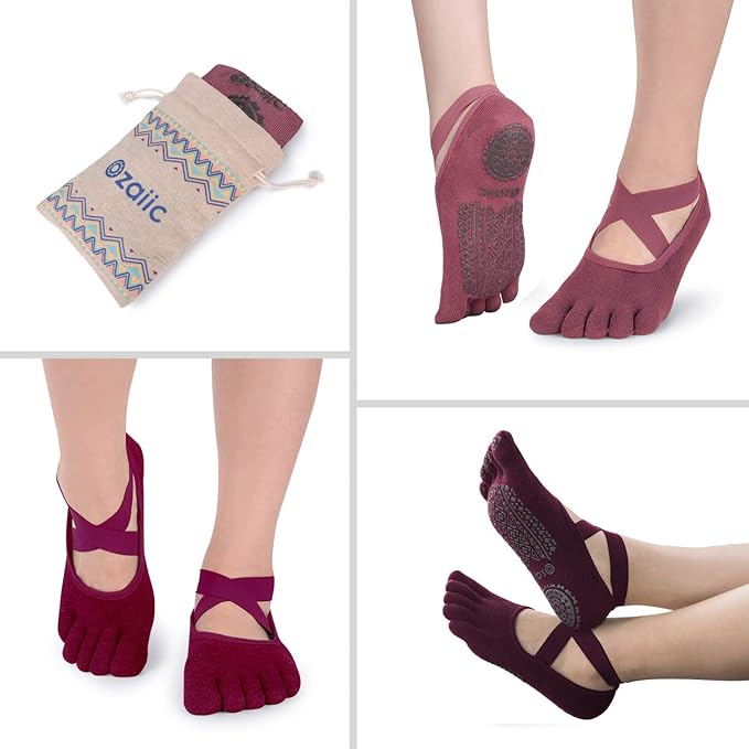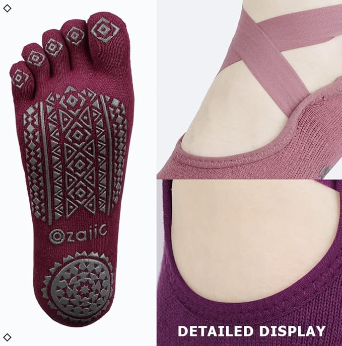 Ozaiic Yoga Socks for Women with Grips, Non-Slip Five Toe Socks for Pilates, Barre, Ballet, Fitness