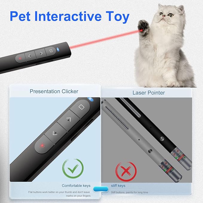 - 【Multi-functional】 The presentation clickers combine the functions of hyperlink, switch windows, page up/down, full /black screen, volume control ect. Plug & Use, no need to download software, senconds to connect, handy to use. The only thing need to do is put an AAA battery(included) in the unit and it is ready to go. The PowerPoint clicker can also be used as cats dogs pet interactive toys.