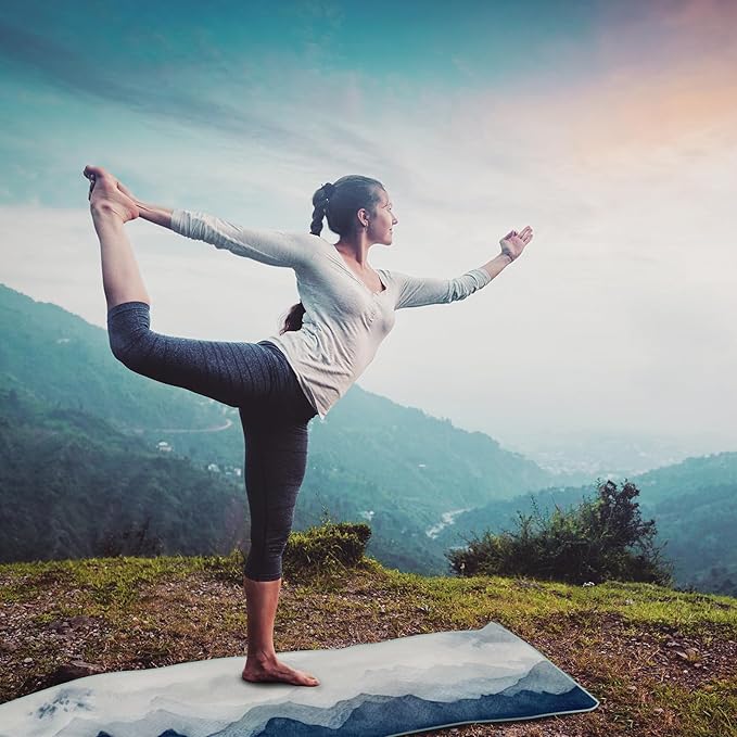 QiyI Yoga Mat Towel with Corner Pockets, Non Slip Sweat Absorbent Hot Yoga Towels, Soft Yoga Blankets with Travel Bag, Skidless Mat Cover for Workout, Gym, Fitness - 70"x26", Watercolor Mountain